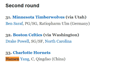 杨瀚森连续4期提升自己摘ESPN模拟选秀的排名,最新一期已经来到次轮总第33顺位被黄蜂选中。如果杨瀚森被黄蜂选中,在处在重建期的黄蜂当中,杨瀚森有望辅佐三球,无疑有望在内线尽情吃饼。